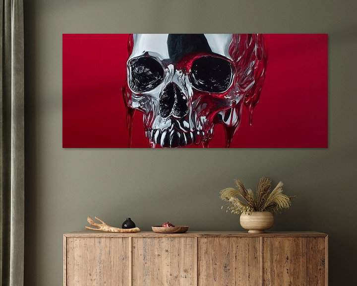Metallisch glänzende Makellosigkeit trifft auf blutroten Kontrast: Ein surrealer Totenkopf wird von schimmernden Rinnsalen umgeben, die seine kühle Präsenz betonen. Diese eindringliche Kunst ist der perfekte Blickfang für ein Wohnzimmer oder eine kreative Büroumgebung, wo sie Gespräche anregen und zum Nachdenken anregen kann. Ideal für Liebhaber des Unkonventionellen!