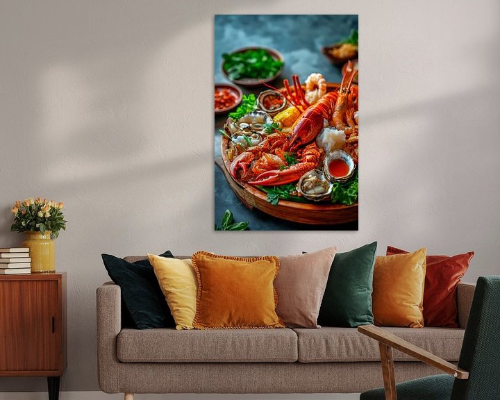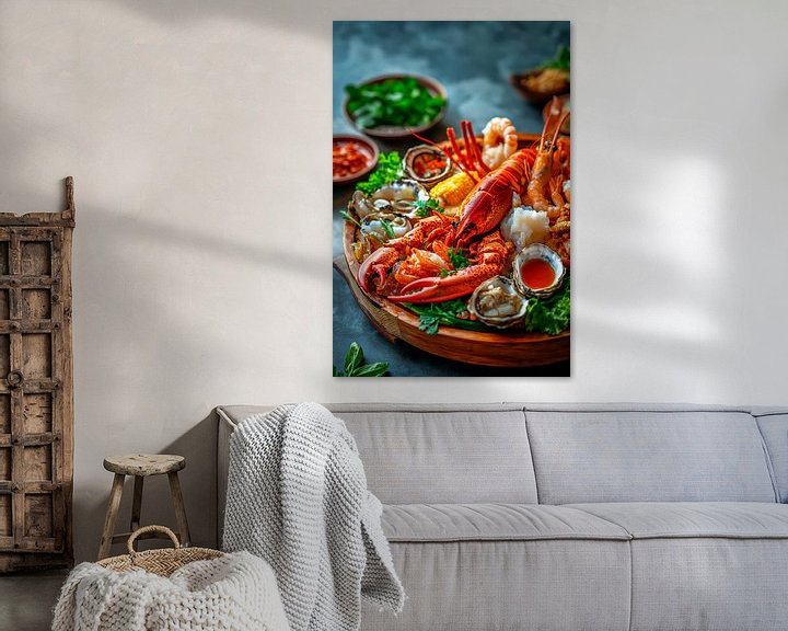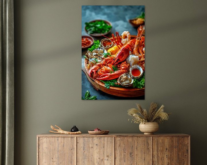 Erhältlich mit oder ohne Passepartout für eine stilvolle Präsentation von Gourmetmeeresschätze auf Holzplatte Kunstwerken.