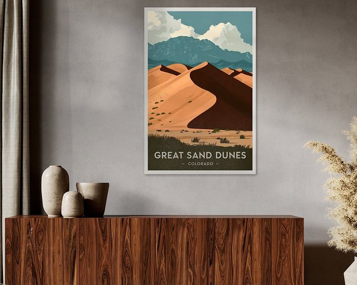 Ein beeindruckendes Wellenmeer aus goldenen Dünen, das den Betrachter in die majestätische Landschaft Colorados entführt. Der Kontrast zwischen sanften Sandhügeln und imposanten Bergen im Hintergrund verleiht dem Raum eine harmonische Ruhe. Ideal für das Wohnzimmer, schafft es eine einladende Atmosphäre, die zum Träumen und Entspannen einlädt.