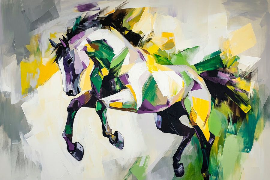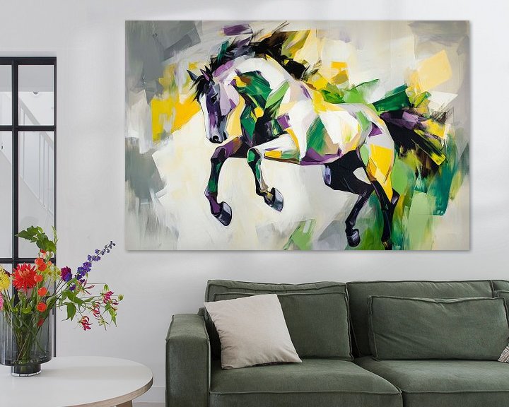 In lebendigen Farben und dynamischen Formen entfaltet sich die Kraft eines springenden Pferdes, das Freiheit und Energie verkörpert. Die künstlerischen Pinselstriche in Grün und Gelb verleihen dem Werk eine frische, lebhafte Atmosphäre, die perfekt in ein kreatives Wohnzimmer oder ein inspirierendes Büro passt. Ein echter Blickfang mit Ausstrahlung!