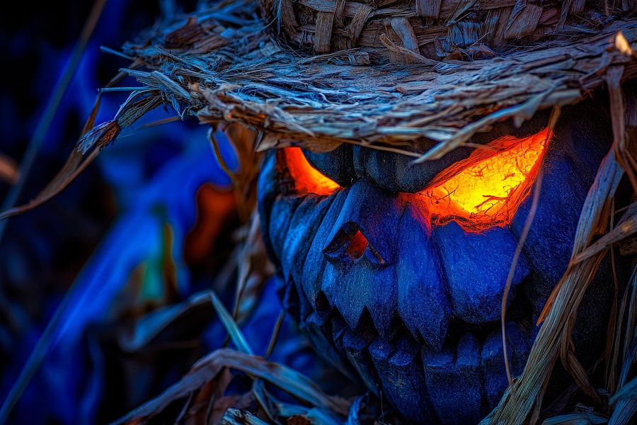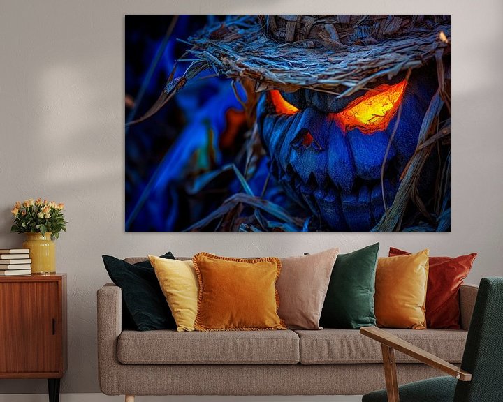 Erhältlich mit oder ohne Passepartout für eine stilvolle Präsentation von Gruselige Kürbiskopf-Dekoration im Dunkeln Kunstwerken.
