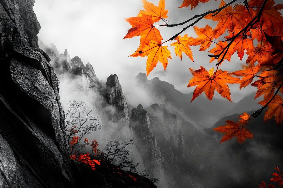 Erhältlich mit oder ohne Passepartout für eine stilvolle Präsentation von Herbstliche Berglandschaft mit Nebel Kunstwerken.