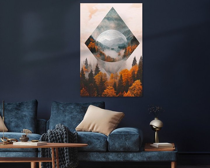 Ein faszinierendes Spiel aus Farben und Formen entfaltet sich vor den Augen: Goldene Herbsttöne umarmen eine geheimnisvolle Mondlandschaft, eingekreist von majestätischen Bergen und dichten Wäldern. Diese harmonische Fusion lädt zum Träumen ein und wäre ein perfekter Blickfang im Wohnzimmer, um jedem Raum eine beruhigende, naturnahe Atmosphäre zu verleihen.