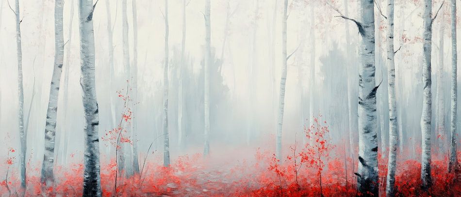 In einem mystischen Nebelmeer erheben sich schlanke Birken, während leuchtend rote Blätter dem monochromen Hintergrund Leben einhauchen. Diese harmonische Verbindung von Natur und Farbe schafft eine beruhigende Atmosphäre, die perfekt ins Schlafzimmer passt, wo sie Ruhe und Inspiration fördert. Ideal für träumerische Momente und kreative Entfaltung.