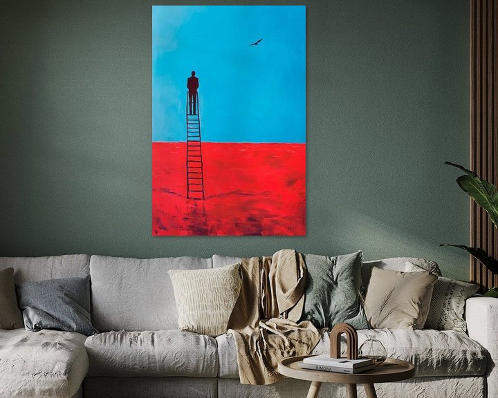 Ein einsamer Mensch steht auf einer Leiter und blickt auf ein leuchtend rotes Meer, während ein einzelner Vogel den tiefblauen Himmel durchquert. Diese Komposition aus Farben und Formen evoziert Gefühle von Sehnsucht und Freiheit. Der Kontrast zwischen der erdigen Leiter und dem lebhaften Hintergrund verstärkt das Gefühl des Suchens nach Orientierung in einer überwältigenden Welt.