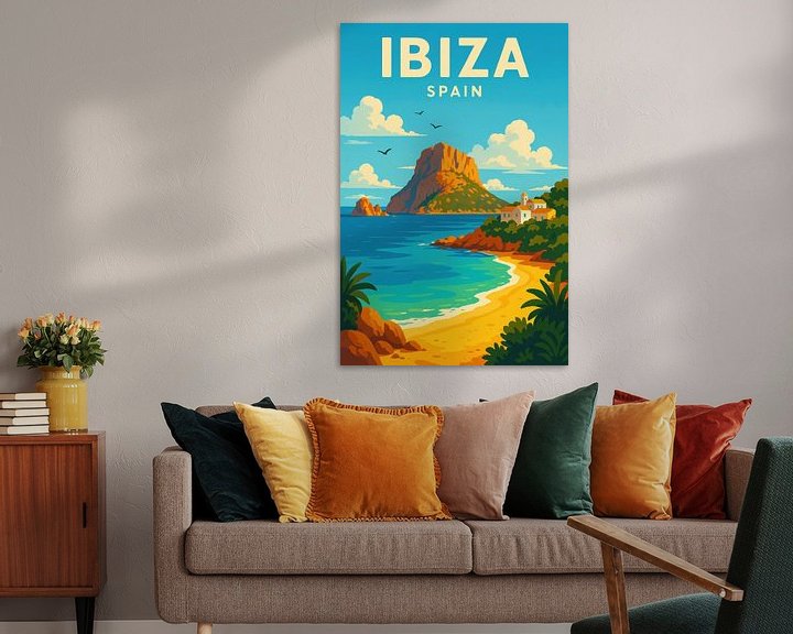 Ein strahlendes Blau, das zum Träumen einlädt, umrahmt von sanften Sandstränden und üppigem Grün. Die imposante Felsformation und verträumten Häuschen versprühen mediterranen Charme. Diese lebendige Szenerie bringt das Urlaubsgefühl in jedes Wohnzimmer und lässt die Sorgen des Alltags schnell verschwinden. Ein perfektes Stück Ibiza für eine entspannte Atmosphäre!