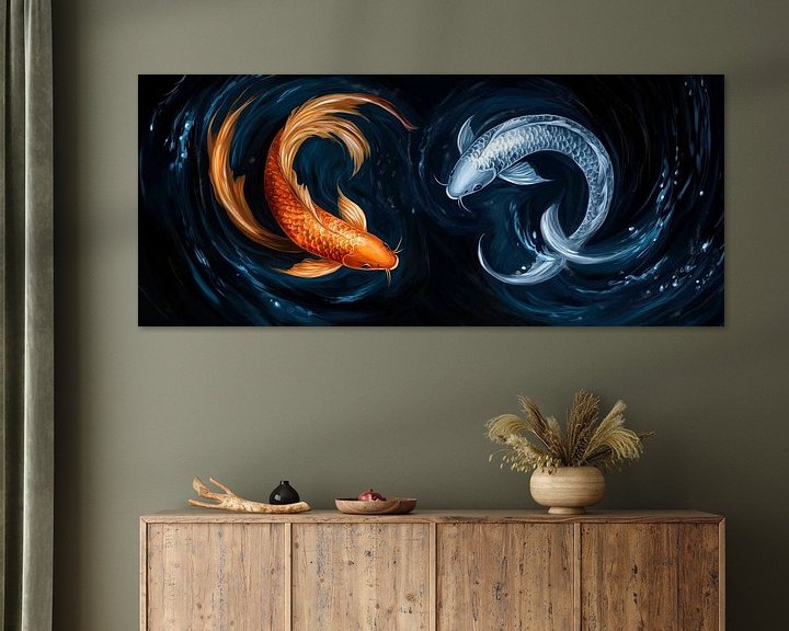 Gerahmte Poster mit Koi-Fische im Tanz – Farbenspiel auf Wasser Kunstdruck