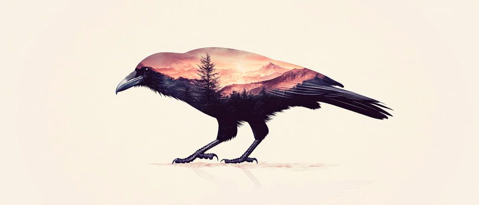 Ein geheimnisvoller Rabe, dessen Körper von einem atemberaubenden Landschaftsgemälde durchzogen ist, verkörpert die Verbindung zwischen Natur und Mystik. Die sanften Farben des Sonnenuntergangs harmonieren wunderbar mit dem schlanken, eleganten Profil des Vogels. Perfekt für ein Wohnzimmer, schafft dieses Kunstwerk eine faszinierende Atmosphäre zum Staunen und Träumen.