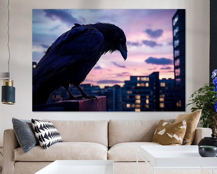 Erhältlich mit oder ohne Passepartout für eine stilvolle Präsentation von Kraftvoller Rabe vor urbanem Sonnenuntergang Kunstwerken.
