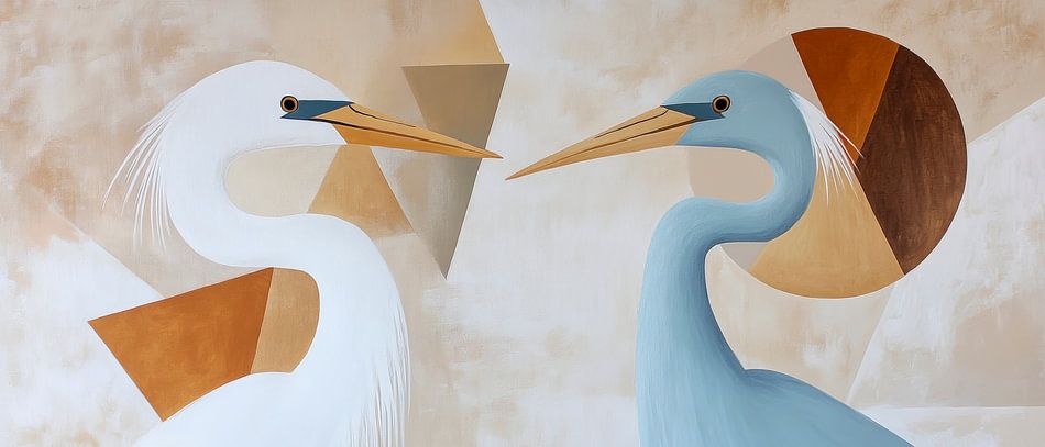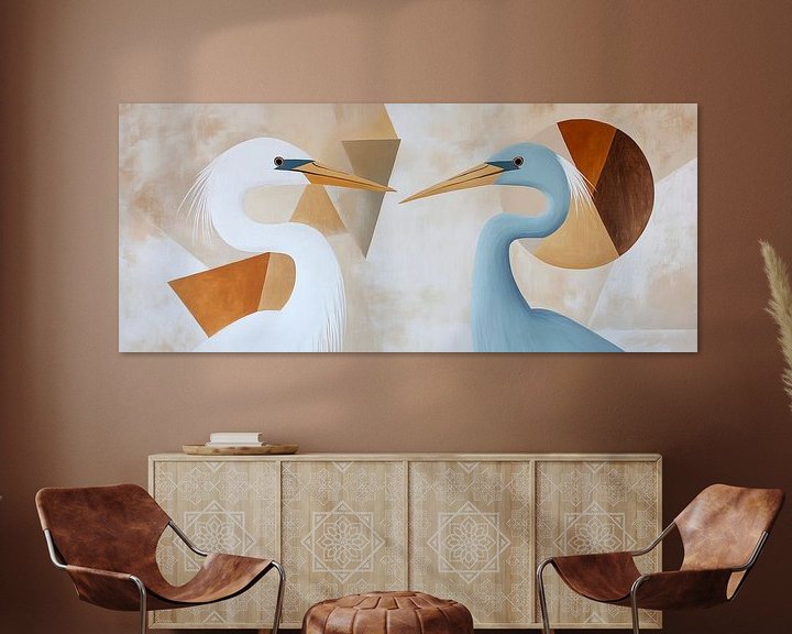 Zwei majestätische Störche begegnen sich in harmonischer Symmetrie, umgeben von warmen Erdtönen und geometrischen Formen. Ihre eleganten Hälse und langen Schnäbel strahlen Anmut aus und schaffen eine ruhige, inspirierende Atmosphäre. Dieses Kunstwerk passt perfekt ins Wohnzimmer oder ins Home Office, wo es kreative Gedanken anregen kann.