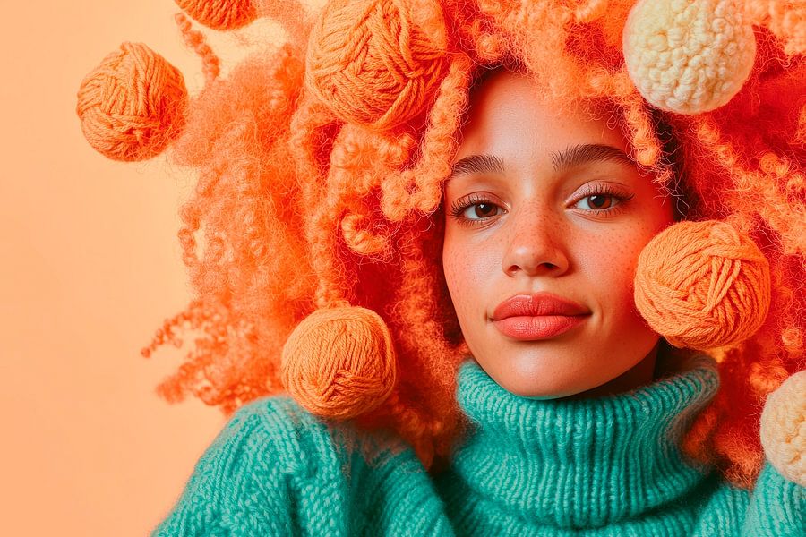 Ein lebendiges Porträt, das mit spritzigen Farben und einem fröhlichen Ausdruck begeistert. Die leuchtend orangefarbene Frisur erinnert an kreative Wolle und vermittelt ein Gefühl von Wärme und Lebensfreude. Dieses kunstvolle Bild würde sich perfekt in einem gemütlichen Wohnzimmer oder einem inspirierenden Atelier machen, wo es Beistand und Kreativität fördert.