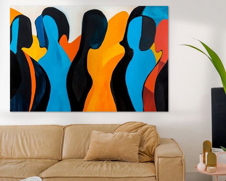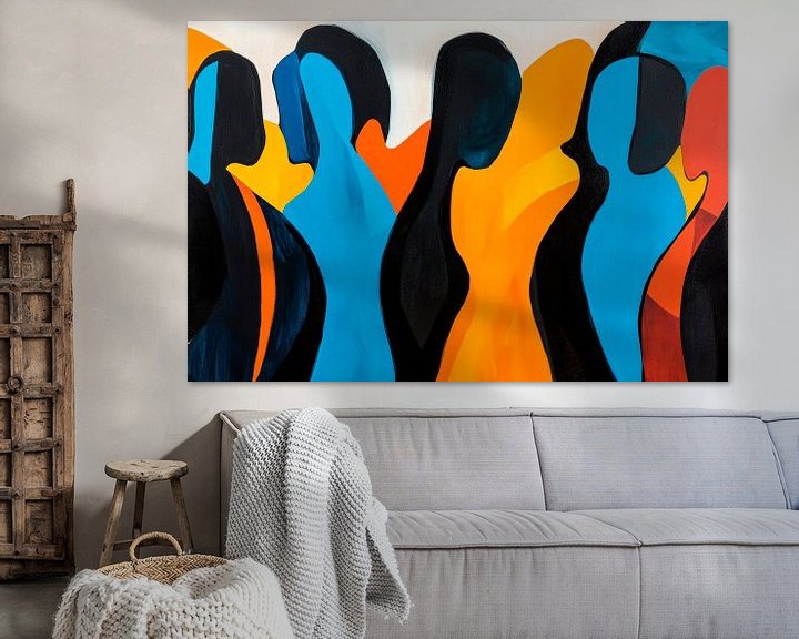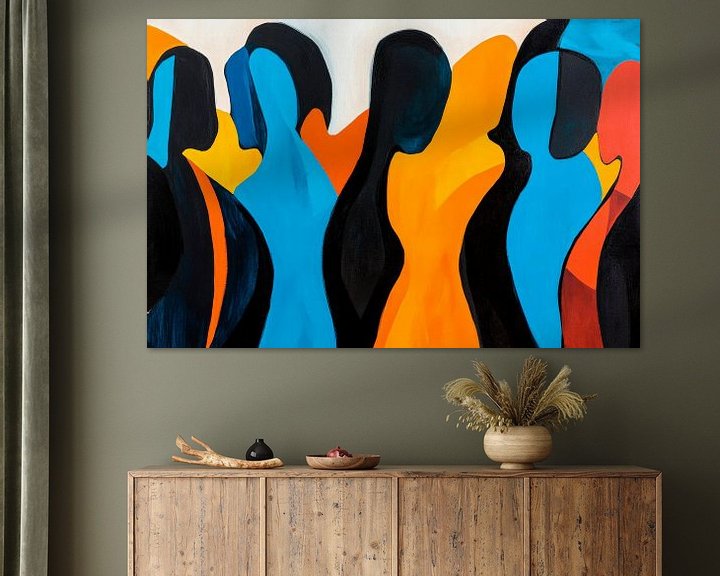 Vibrante Silhouetten in lebendigen Blau- und Orangetönen tanzen harmonisch, während sie eine mysteriöse Geschichte erzählen. Diese faszinierende Komposition lässt Raum für Interpretation und zieht die Blicke an. Sie findet ihren perfekten Platz im Wohnzimmer, wo sie Gespräche anregt und eine einladende Atmosphäre schafft.
