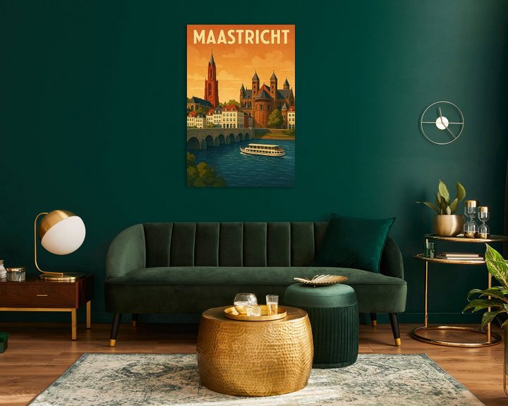 Eine malerische Ansicht von Maastricht entfaltet sich vor dem Betrachter, mit rot schimmernden Türmen und prächtigen Burgen, die sich majestätisch am Wasser erheben. Die sanften Wellen des Flusses spiegeln die Farben des Sonnenuntergangs wider und verleihen jedem Raum einen Hauch von fernwehvollem Charme. Perfekt für das Wohnzimmer, um Gespräche und Träume zu inspirieren.