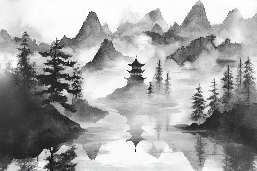 In sanften Grautönen entfaltet sich eine traumhafte Landschaft, in der majestätische Berge und filigrane Bäume harmonisch miteinander verschmelzen. Ein rätselhafter Tempel thront am Ufer eines stillen Sees, während der Nebel mystisch darüber schwebt. Diese zeitlose Komposition bringt Ruhe und Inspiration in jedes Wohnzimmer und lädt zur Kontemplation ein.