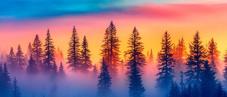 Wenn die sanften Nebelschwaden die majestätischen Silhouetten der immergrünen Bäume umhüllen und der Himmel in zauberhaften Farben erstrahlt, entsteht eine Atmosphäre der Ruhe und des Geheimnisses. Diese harmonische Komposition bringt Naturverbundenheit ins Wohnzimmer und zaubert eine beruhigende Stimmung, die zum Träumen einlädt.