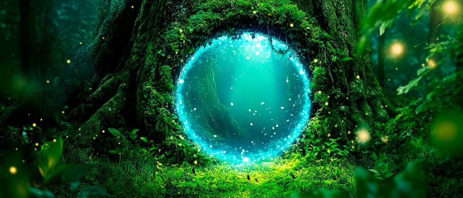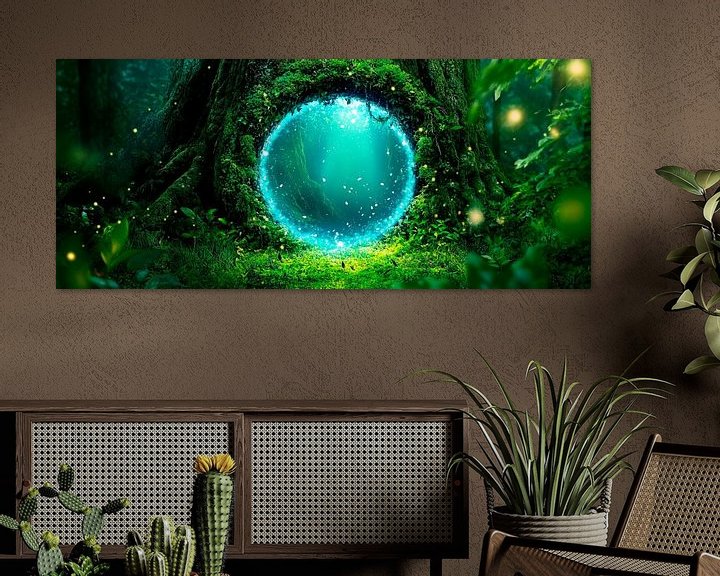 Ein leuchtender torförmiger Eingang in eine magische Waldlandschaft zieht den Betrachter in seinen Bann. Umgeben von üppigem Grün und sanften Lichtreflexen wirkt er wie ein Portal in eine andere Welt. Perfekt für das Wohnzimmer, um eine verzaubernde Atmosphäre zu schaffen und Träume von Abenteuern zu entfachen.