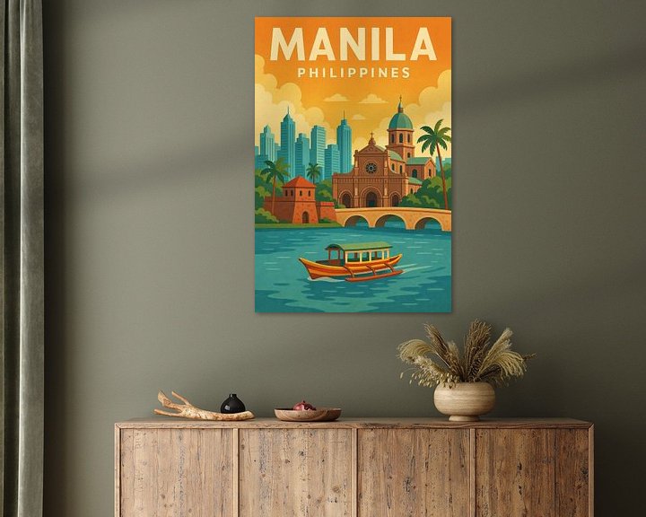Tropische Farben und eine einladende Atmosphäre zaubern das Flair von Manila in jeden Raum. Die lebendige Bootsfahrt, umgeben von ikonischen architektonischen Schönheiten und Palmen, weckt Reiseträume. Ideal für ein Wohnzimmer, das Gemütlichkeit und Abenteuer vereint, und eine tolle Stimmung verbreitet, die Erinnerungen an ferne Länder weckt.