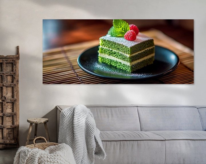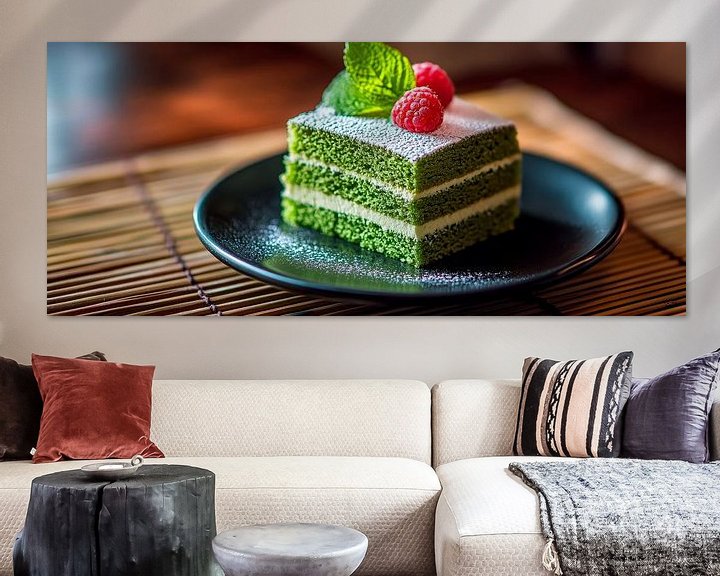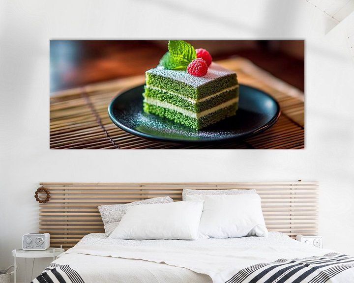 Erhältlich mit oder ohne Passepartout für eine stilvolle Präsentation von Matcha-Torte mit Himbeeren und Minze Kunstwerken.