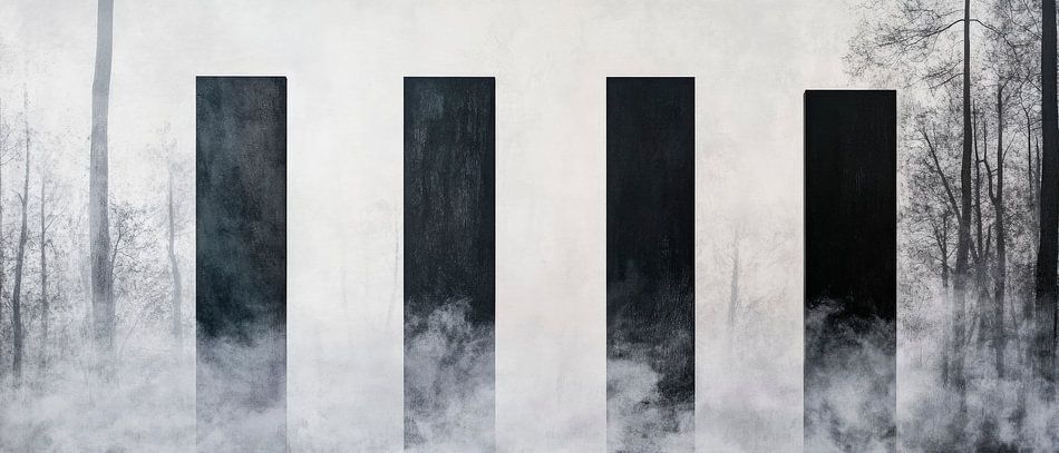 In geheimnisvoller Stille erheben sich Schatten rechteckig gegen einen nebligen Hintergrund, während die spärlichen Baumumrisse eine melancholische Atmosphäre schaffen. Diese faszinierende Komposition eignet sich perfekt für ein modernes Wohnzimmer, um Gäste zu fesseln und Gespräche anzuregen. Ihre kühle Farbpalette verleiht jedem Raum einen Hauch von Eleganz und Mystik.