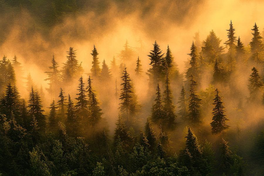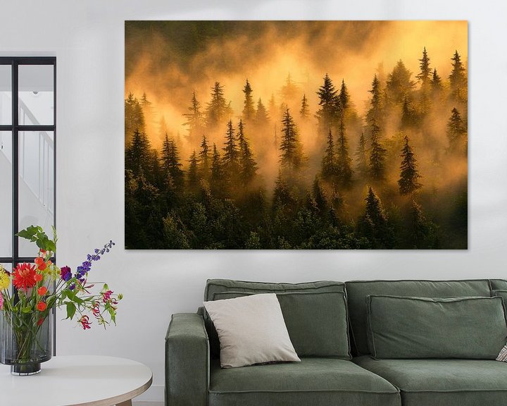 In sanften Goldtönen tummeln sich majestätische Tannen in einem mystischen Nebelmeer, das eine geheimnisvolle Stimmung verbreitet. Diese harmonische Verbindung von Licht und Schatten lädt zum Träumen ein und verleiht jedem Raum eine beruhigende Note. Ideal für das Schlafzimmer oder Wohnbereich, um eine Atmosphäre der Ruhe und Naturverbundenheit zu schaffen.