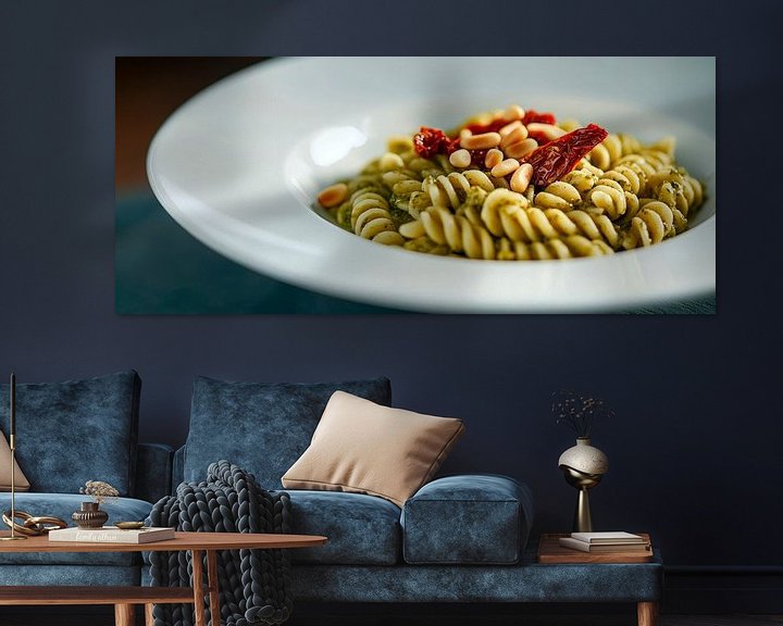 Erhältlich mit oder ohne Passepartout für eine stilvolle Präsentation von Pasta mit Pesto und sonnengereiften Tomaten Kunstwerken.
