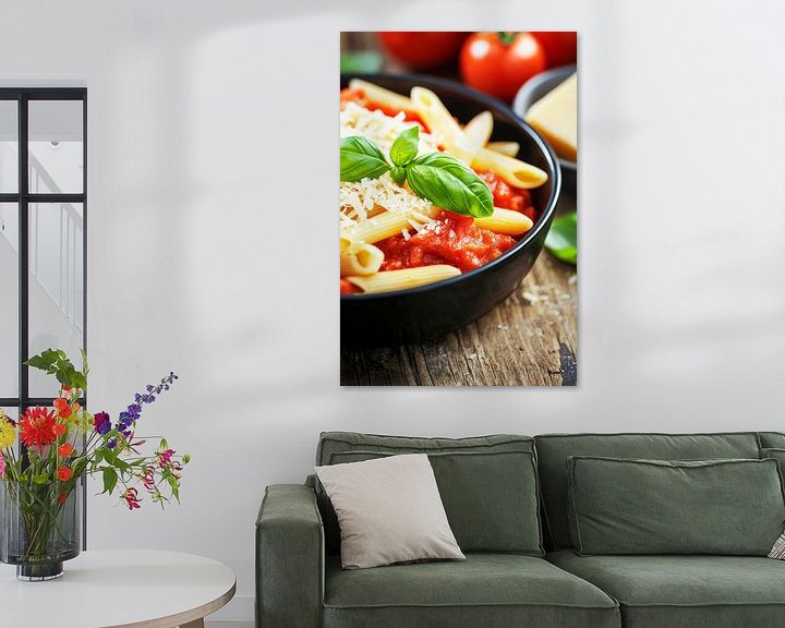 Erhältlich mit oder ohne Passepartout für eine stilvolle Präsentation von Pasta mit Tomatensauce und Basilikum Kunstwerken.