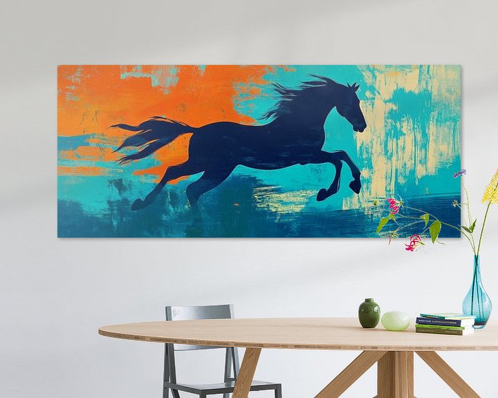 Gerahmte Poster mit Pferd im Sprung – Abstrakte Farbkomposition Kunstdruck