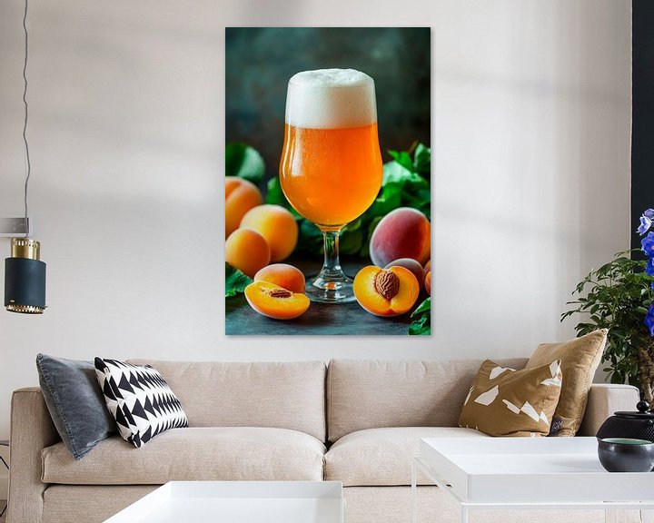 Sommerliche Frische strömt aus diesem einladenden Glas, gefüllt mit goldenem Getränk, das mit cremigem Schaum krönt ist. Saftige Aprikosen und Pfirsiche umrahmen die Szenerie und verleihen eine fruchtige Note. Ein perfektes Kunstwerk fürs Küchen- oder Esszimmer, um die Leichtigkeit der warmen Monate einzufangen und Gäste zu inspirieren.