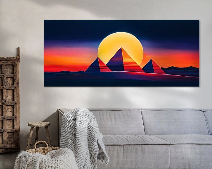 Erhältlich mit oder ohne Passepartout für eine stilvolle Präsentation von Pyramiden unter einem leuchtenden Sonnenuntergang Kunstwerken.