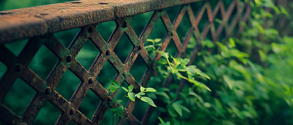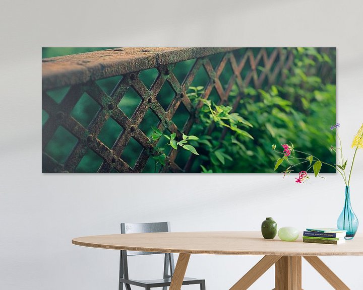 Erhältlich mit oder ohne Passepartout für eine stilvolle Präsentation von Rostige Gitterstruktur mit Pflanzen Kunstwerken.