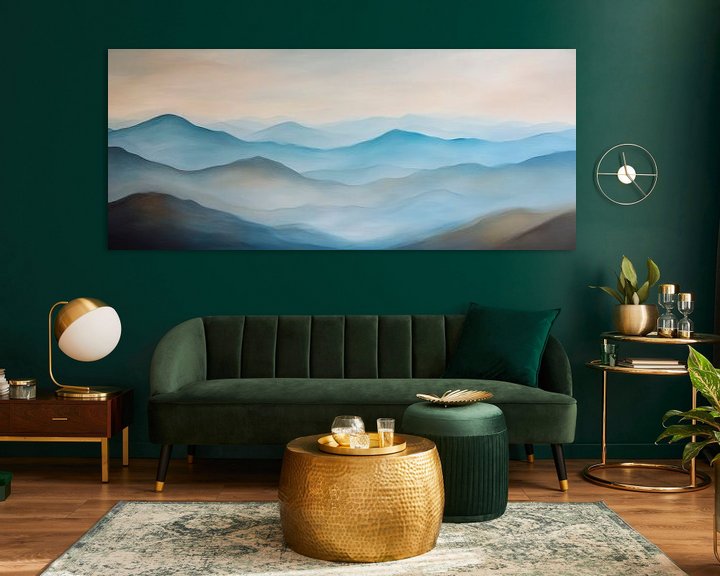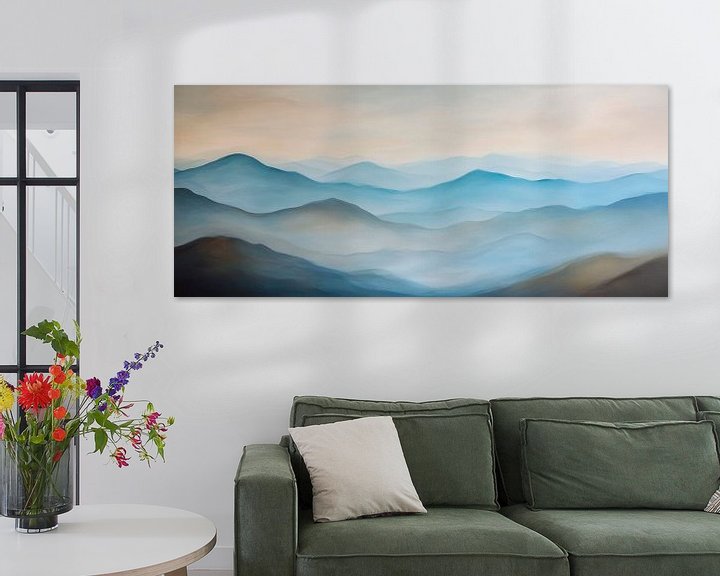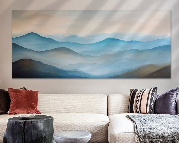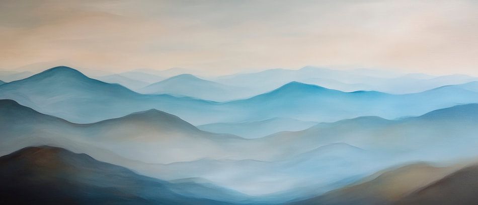 Sanfte Hügel in einem Verwirrspiel aus zartem Blau und subtilen Grautönen laden zur Ruhe ein. Die harmonische Farbpalette vermittelt ein Gefühl von Weite und Gelassenheit, ideal für ein Schlafzimmer oder einen meditativen Raum. Dieses Kunstwerk schafft eine entspannte Atmosphäre, die zum Träumen und Atemholen einlädt.