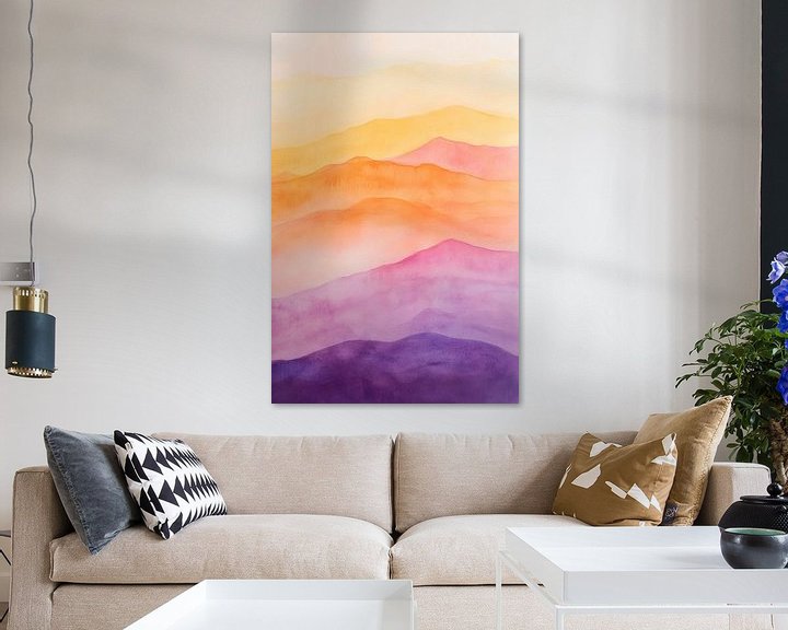 Sanfte Hügel in warmen Ombre-Tönen fließen harmonisch ineinander und erzeugen eine beruhigende Atmosphäre. Die sanften Übergänge von Gelb zu Lila verleihen dem Raum eine einladende Wärme. Ideal für das Schlafzimmer oder Wohnzimmer, wo sie eine entspannende Zen-Atmosphäre schaffen und den Blick nach außen auf die Natur lenken.