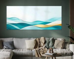 Sanfte, fließende Linien in beruhigenden Blau- und Grüntönen vermitteln das Gefühl von Frieden und Harmonie. Ein warmer Gelbton, der durch die Wellen schimmert, bringt einen Hauch Sonnenstrahlen in die Szene. Ideal für das Wohnzimmer, um eine entspannende Atmosphäre zu schaffen, die zum Verweilen einlädt.