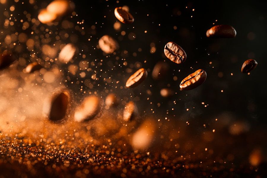 Erhältlich mit oder ohne Passepartout für eine stilvolle Präsentation von Schwebende Kaffeebohnen mit Staubpartikeln Kunstwerken.