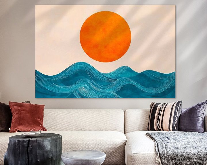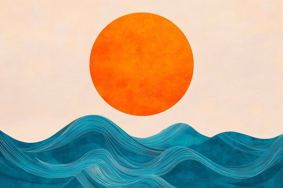 Ein leuchtender Sonnenball schwebt majestätisch über sanften, wellenförmigen Bewegungen in erfrischendem Blau. Die harmonische Farbkombination vermittelt Ruhe und Lebensfreude, perfekt geeignet für das Wohnzimmer oder das Schlafzimmer, um eine entspannende, einladende Atmosphäre zu schaffen und die Gedanken zum Fließen zu bringen.