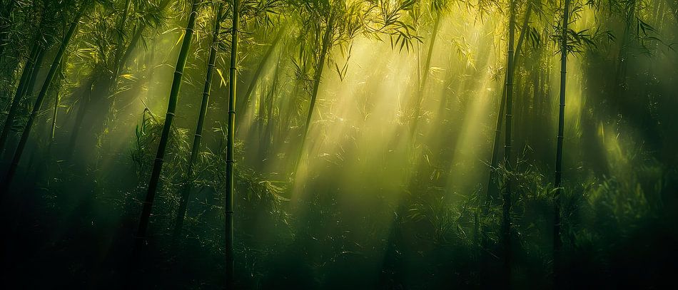 Erhältlich mit oder ohne Passepartout für eine stilvolle Präsentation von Sonnenstrahlen im dichten Wald Kunstwerken.