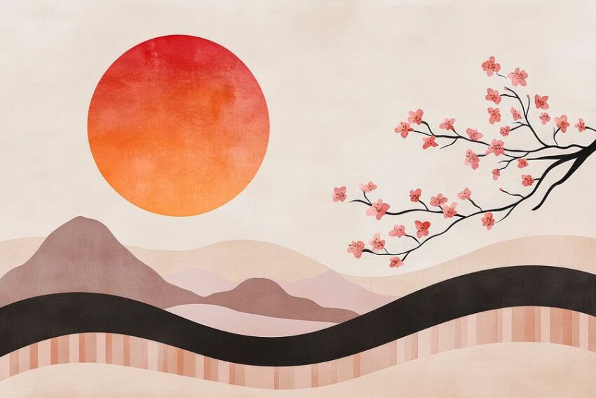 Erhältlich mit oder ohne Passepartout für eine stilvolle Präsentation von Sonnenuntergang mit Kirschblüten – Minimalistisch Kunstwerken.