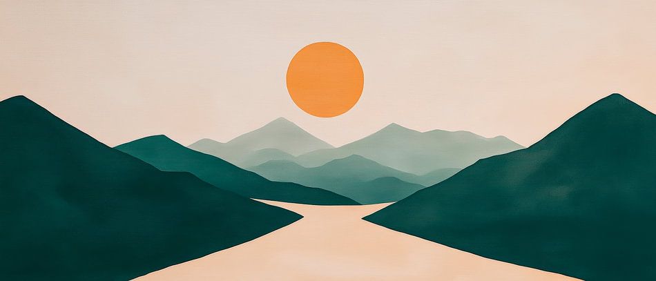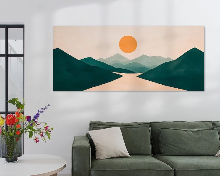 Erhältlich mit oder ohne Passepartout für eine stilvolle Präsentation von Sonnenuntergang über Berglandschaft – Minimalistisch Kunstwerken.