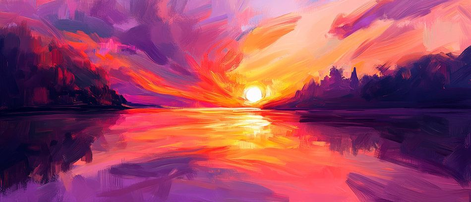 Erhältlich mit oder ohne Passepartout für eine stilvolle Präsentation von Sonnenuntergang über stiller Wasserfläche Kunstwerken.