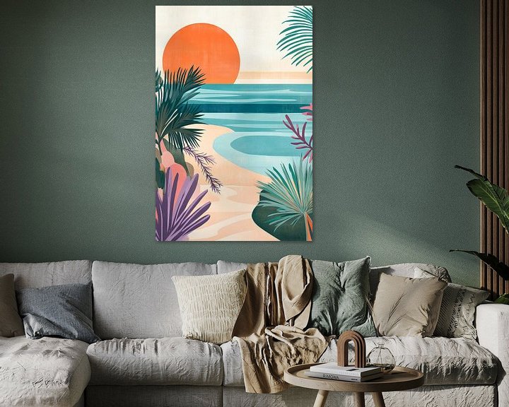 Erhältlich mit oder ohne Passepartout für eine stilvolle Präsentation von Sonnenuntergang über tropischem Strand Kunstwerken.
