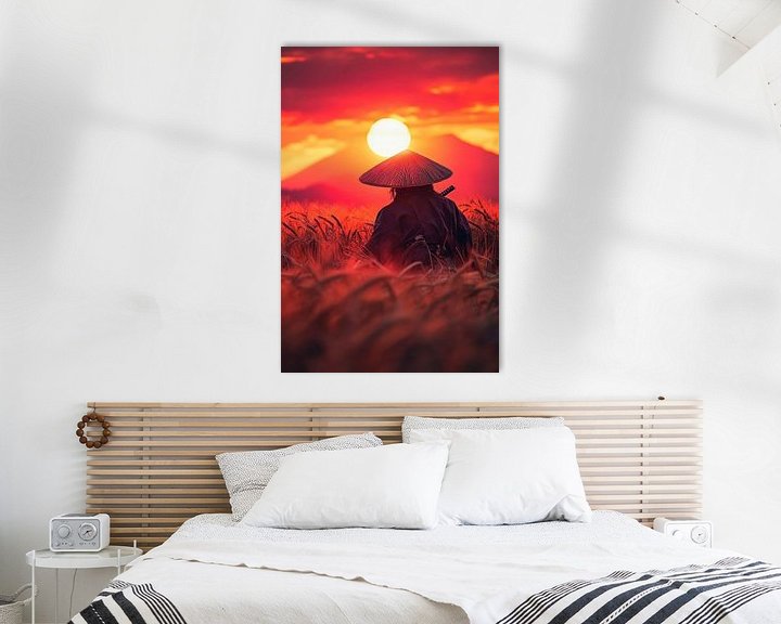 Ein sanfter Sonnenuntergang taucht die Landschaft in warme, satte Farben, während eine silhouettierte Figur in traditioneller Kleidung in der Ferne zu sehen ist. Das goldene Licht reflektiert die ruhige, harmonische Atmosphäre, die perfekt für eine entspannte Ecke im Wohnzimmer ist, um den Tag stilvoll ausklingen zu lassen.