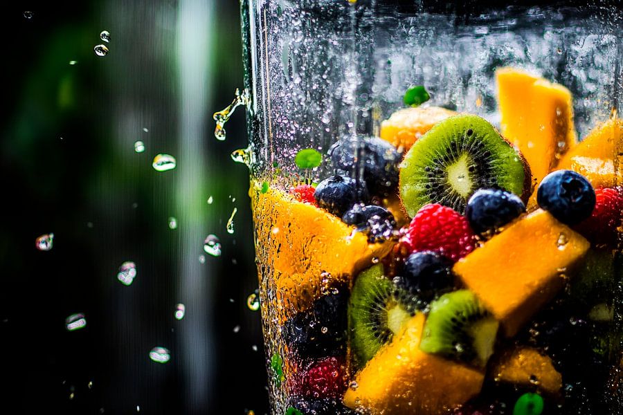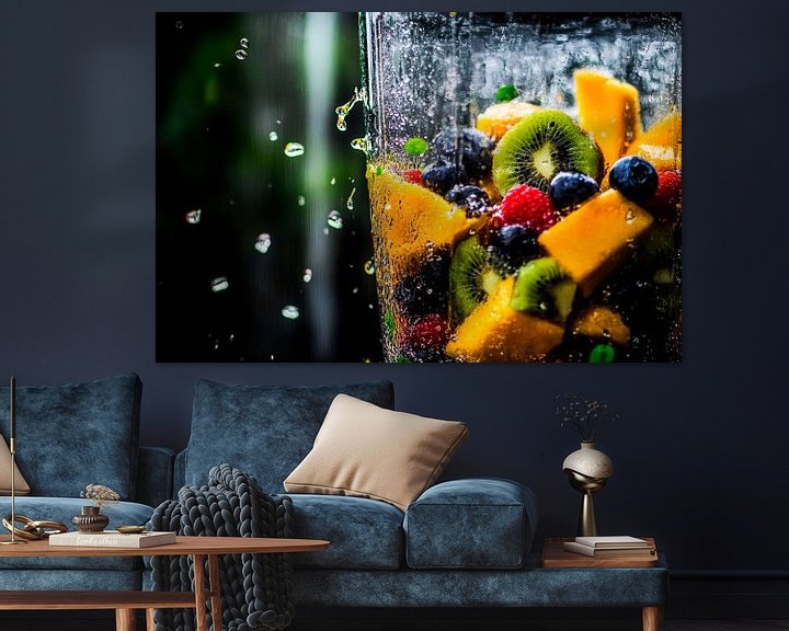 Erhältlich mit oder ohne Passepartout für eine stilvolle Präsentation von Spritzige Fruchtmix-Explosion im Mixer Kunstwerken.
