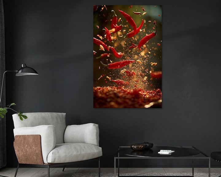 Erhältlich mit oder ohne Passepartout für eine stilvolle Präsentation von Spritzige rote Chilis in Aktion Kunstwerken.