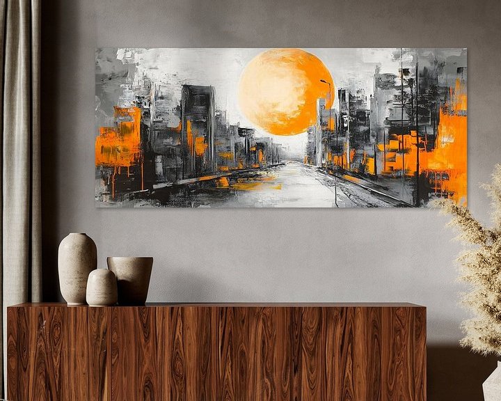 Ein leuchtender Sonnenuntergang umhüllt eine beeindruckende Stadtlandschaft, in warmen Orangetönen und kühlem Grau. Die stilisierten Gebäude scheinen förmlich in das Licht zu tauchen, während eine ruhige Wasserfläche unbeschreibliche Tiefe verleiht. Perfekt für das Wohnzimmer, bringt dieses Kunstwerk eine harmonische Balance zwischen modernem Flair und beruhigender Atmosphäre.