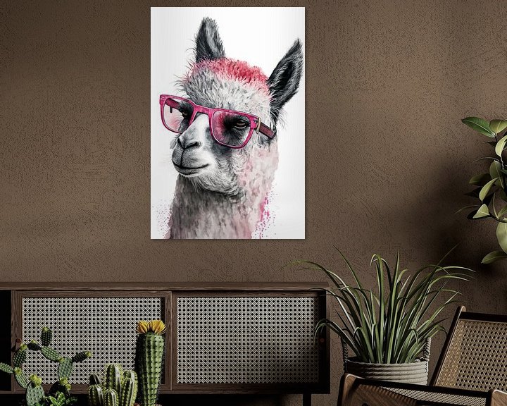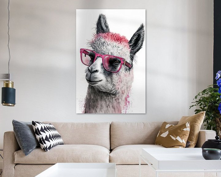 Stilvolles Alpaka mit Pinker Sonnenbrille gedruckt in Premium-Qualität auf Satin-Fotopapier.