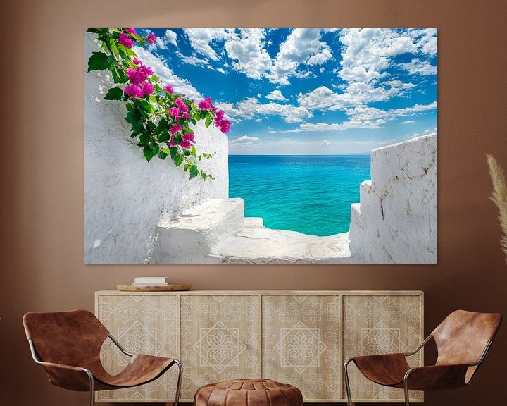 Ein atemberaubender Ausblick über azurblaues Wasser und strahlend weiße Wände, geschmückt mit leuchtenden Bougainvillea-Blüten. Diese traumhafte Szenerie weckt Urlaubsgefühle und wäre ein perfekter Blickfang im Wohnzimmer oder Flur, um jeden Raum mit einem Hauch mediterraner Leichtigkeit zu bereichern. Ideal für entspannte Gespräche und Tagträume!
