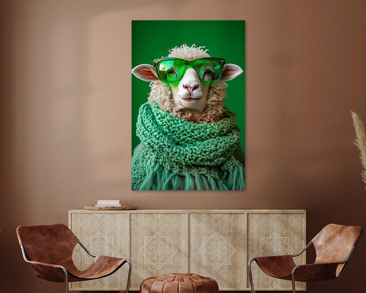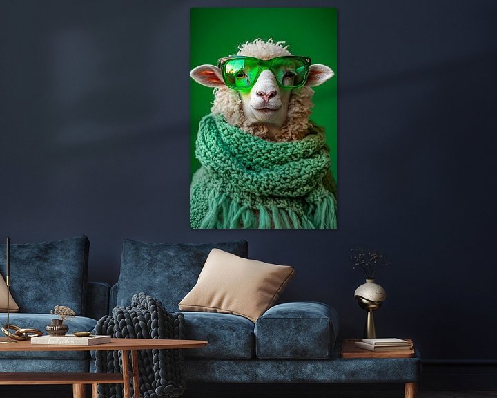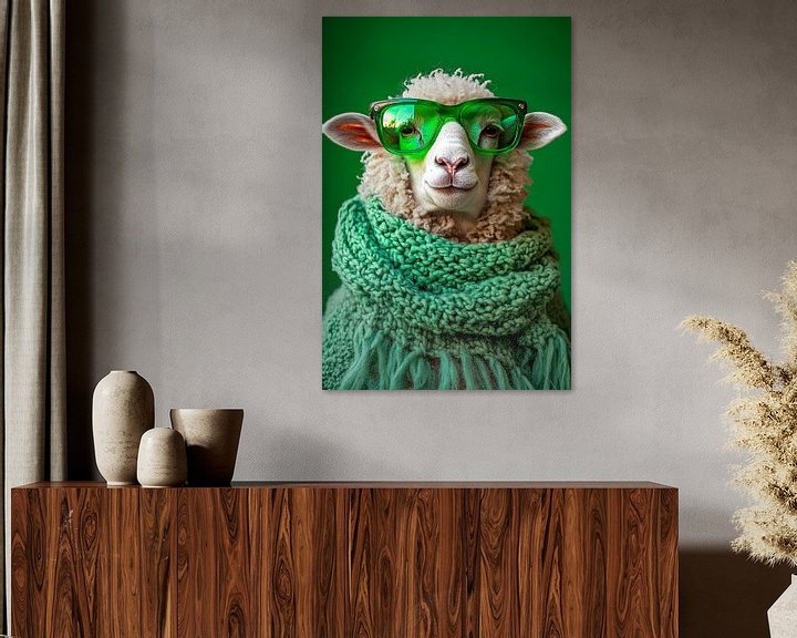 Erhältlich mit oder ohne Passepartout für eine stilvolle Präsentation von Stylisches Schaf mit grüner Brille Kunstwerken.