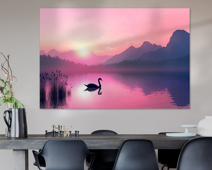 In einer traumhaften Sylhouette erstrahlt ein eleganter Schwan auf spiegelndem Wasser, während sanfte Lichtstrahlen den Himmel in zarte Rosatöne tauchen. Im Hintergrund erheben sich majestätische Berge, die die friedliche Szene umrahmen. Diese harmonische Komposition bringt Ruhe und Eleganz – perfekt für das Schlafzimmer oder ein entspannendes Wohnzimmer, wo sie für gelassene Momente sorgt.