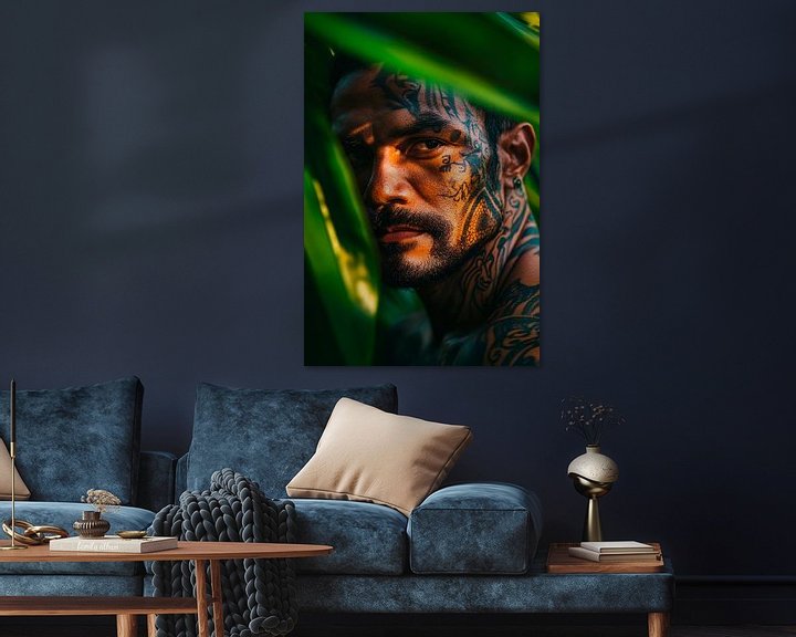 Ein fesselnder Blick, umgeben von üppigem Grün, erzählt von Geschichten und Tiefen. Die kunstvollen Tattoos verleihen dem Porträt eine starke, individuelle Note, die sowohl Kraft als auch Charakter ausstrahlt. Ideal für das Wohnzimmer, wo es als Gesprächsanstoß und Eyecatcher fungiert, verleiht es dem Raum einen einzigartigen, urbanen Flair.