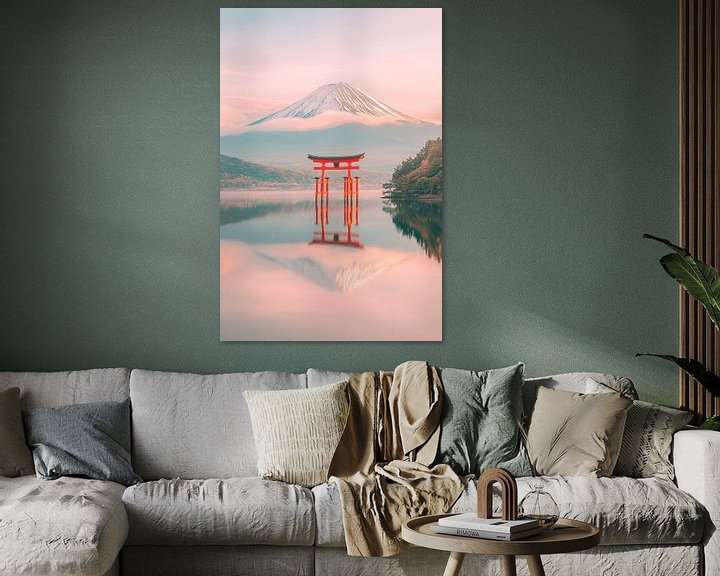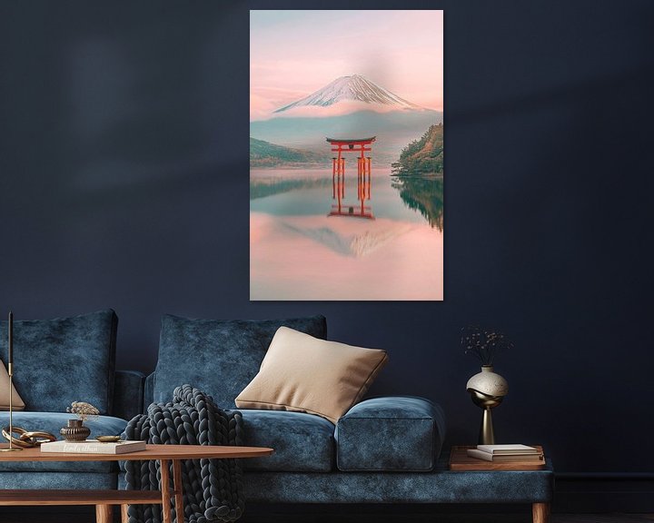 Ein majestätischer Torii erhebt sich anmutig über dem ruhigen Wasser, während der schneebedeckte Fuji im Hintergrund strahlt. Sanfte Pastellfarben des Sonnenaufgangs kreieren eine friedliche Atmosphäre, die die Seele beruhigt. Dieses harmonische Meisterwerk eignet sich hervorragend für ein Schlafzimmer, um einen Hauch von Zen und Ruhe zu verbreiten.